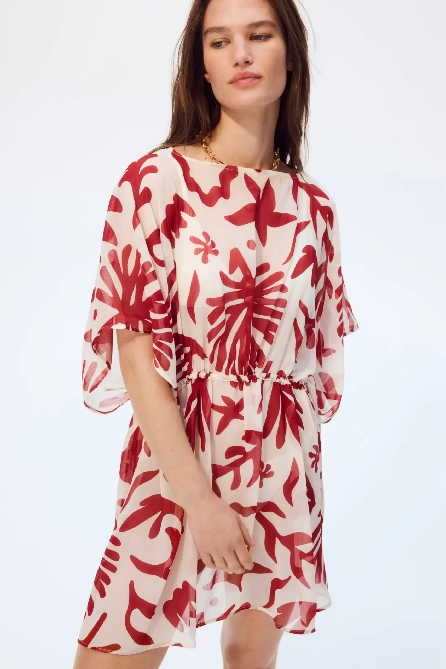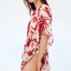 Lightweight sheer cover-up dress featuring a bold scarlet botanical print, relaxed silhouette, and adjustable gathered waist for effortless summer styling. Perfect for layering over swimwear with minimal accessories for an elevated resort look.